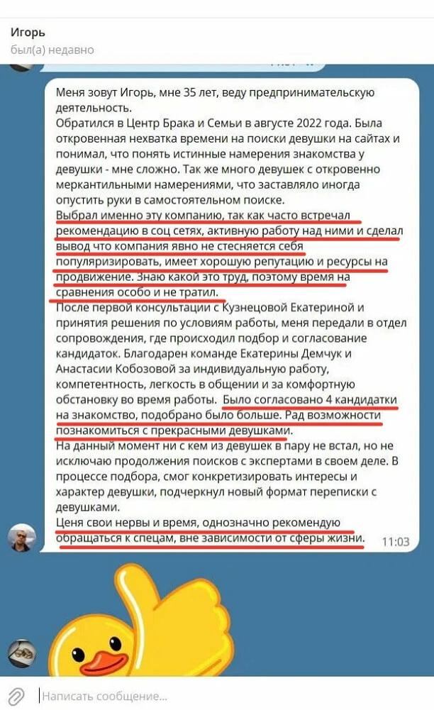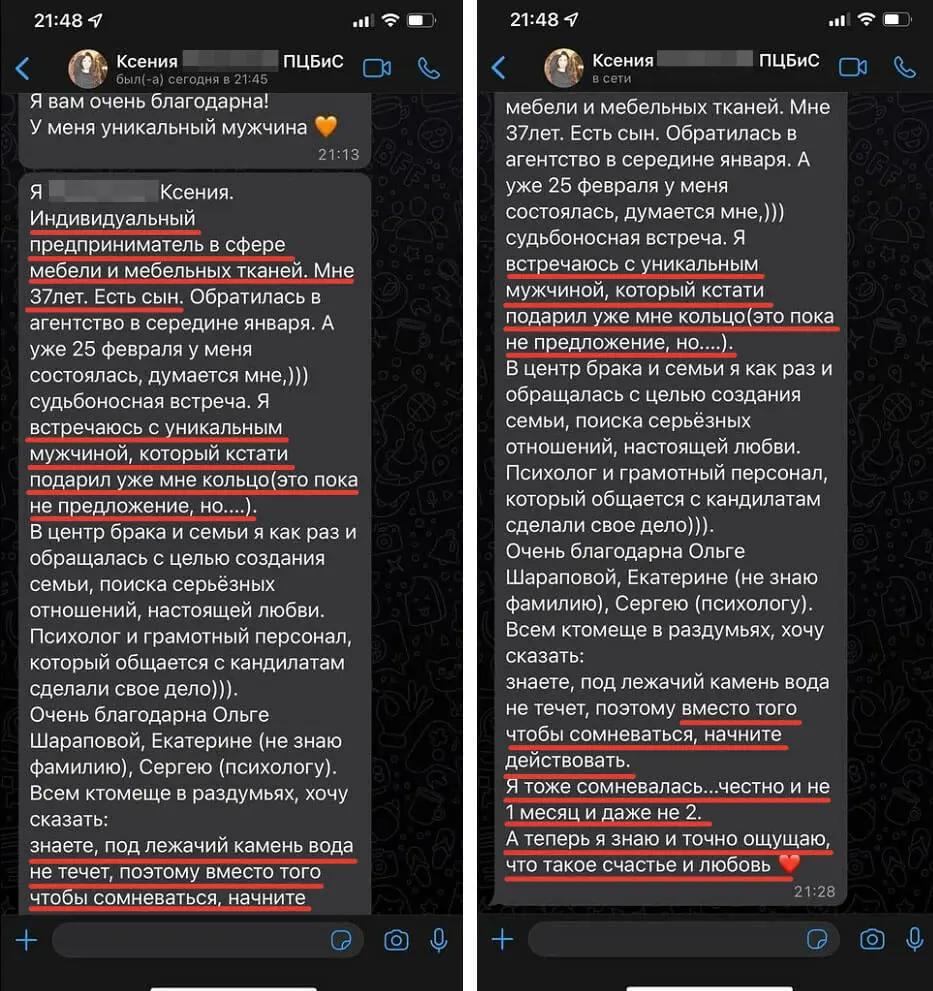 «Хотим поблагодарить организаторов этого сайта. Здесь мы нашли друг друга и счастливы! Признаюсь, я не особо верила что можно вот так познакомиться в интернете и создать семью, но с нами так и произошло! Желаем всем найти своё счастье!»